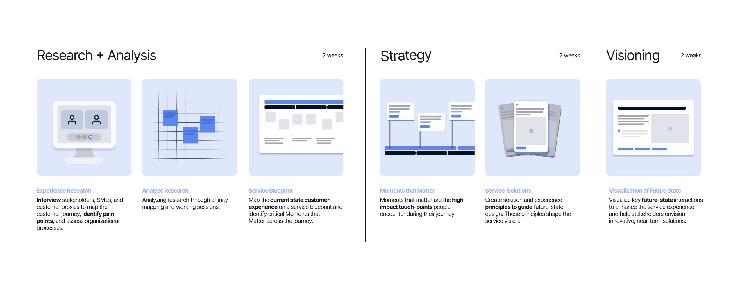 Method partnered with the Service Experience team in a multi-week engagement to clarify the current state, surface root problems, and create a future-facing vision that could align stakeholders, guide investment, and inspire confidence.